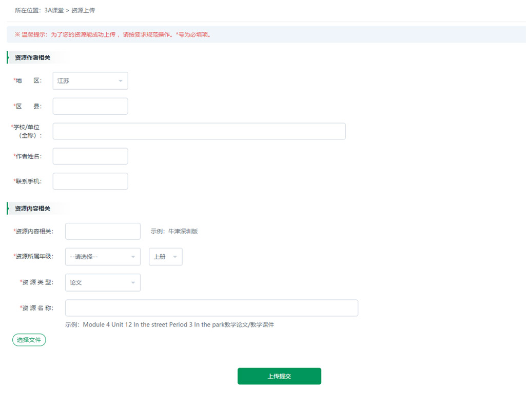 第四步:在资源上传页面中填写地区、县区、学校、作者姓名、联系手机等信息,然后点击"选择文件"将